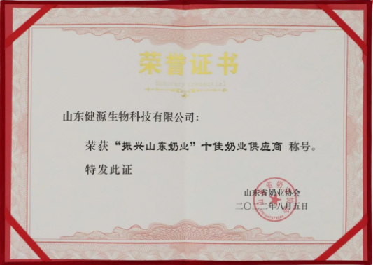 山東健源生物科技有限公司榮獲“振興山東奶業(yè)”十佳奶業(yè)供應(yīng)商 稱號(hào)