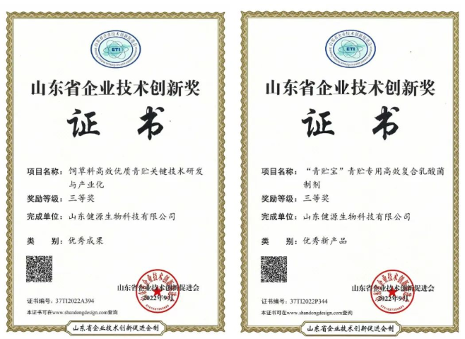 2022-11-1 祝賀山東健源生物(青貯寶)產(chǎn)品榮獲“2022年度創(chuàng)新型飼料添加劑”榮譽(yù)稱(chēng)號(hào)